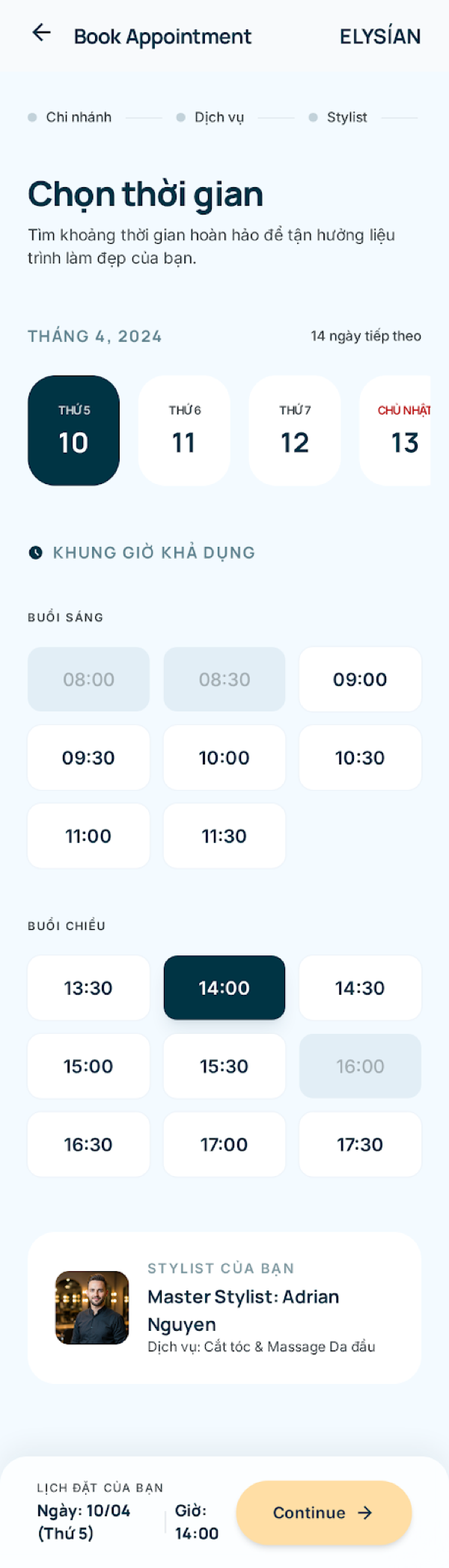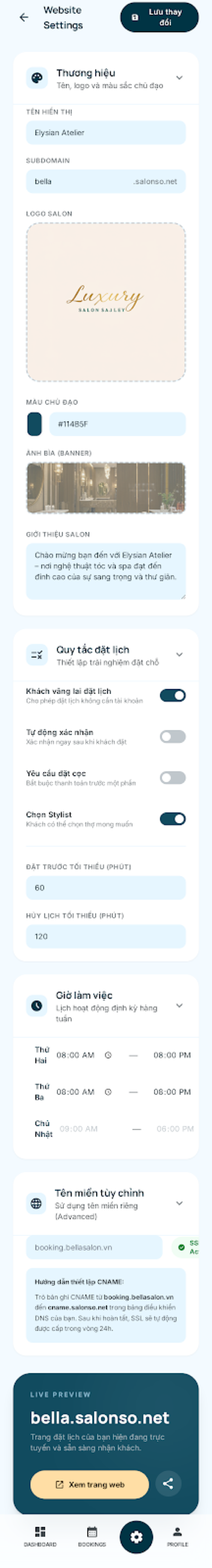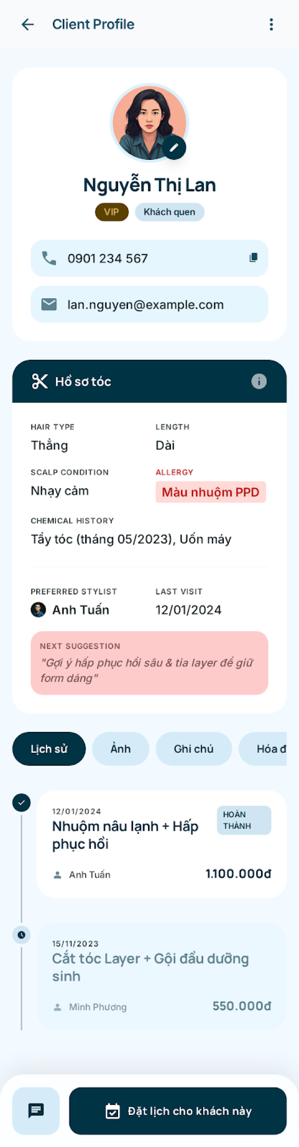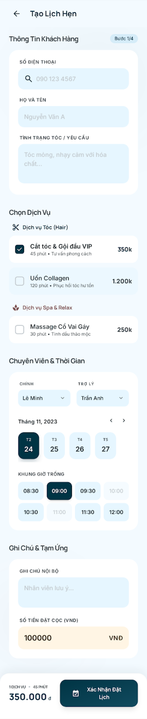 Không có trang web chuyên nghiệp cho khách đặt lịch. Phải trao đổi qua tin nhắn, dễ sai sót.
